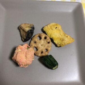 中に入っているのはこの5種類で、かぼちゃ・れんこん・オクラ・紅生姜のかき揚げ・茄子です。