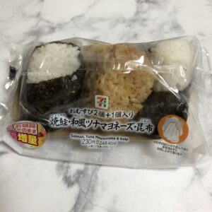 鮭と和風マヨネーズの人気のおむすび2個入りに、昆布のおむすびが1個追加で入っています。