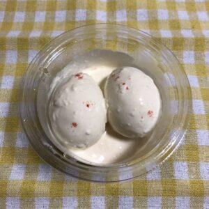フィルムを剥がして直に中を見てみると、白い卵が白いソースに溺れて、オシャレ感のある赤いパウダーでトッピングされていました。