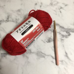 赤いポコポコした玉はダイソーのアクリル毛糸 並太のレッドを6号で編みました。