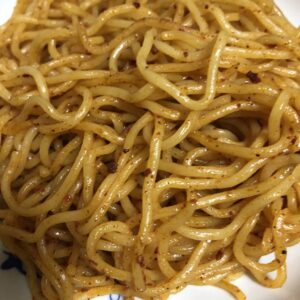 麺をアップで見てみると唐辛子がチラホラと居ますが、カラムーチョと変わらぬ美味しい辛さなのでご安心ください。