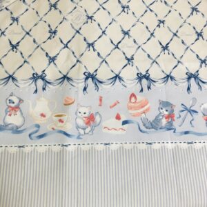 ストライプ、猫ちゃん、リボンの3種類の柄が組み合わさっている生地で、片側に特徴的な柄があるタイプです。
