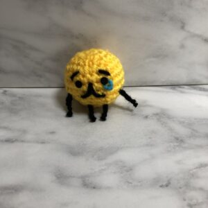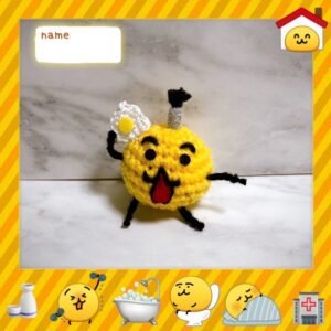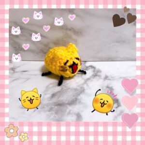 お口の部分は見えないように黄色の毛糸を通して、後ろに引き上げるようにしてぐぬぬ感を出すように工夫しました。