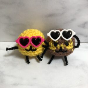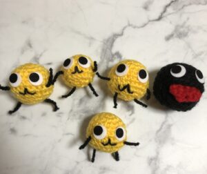 えもじの子に使用した毛糸はダイソーのアクリル毛糸 並太のエッグイエローと、Can doのZAKKAアクリルの黒です。