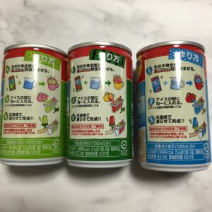 それぞれ1缶160ml入っていて、ダイソーやスーパーで100円くらいで購入することができました。