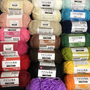 少し前のものから現在販売されているものが混ざっていますが、ダイソーで購入してきたアクリル毛糸 並太です。