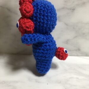 赤い部分を6号で編んで出来るだけ小さくなるように、青い体は7号で編んでバランスが取れるように工夫して完成させてみました。