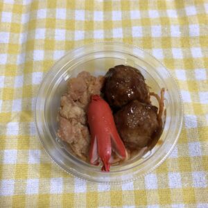 前はミートボールとタコさんウインナーにパスタが入っていたんですが、今回は唐揚げが追加されております!!