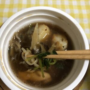 温めてくるとこんな感じで、色が黒めのスープに具材が沈んでいます。
