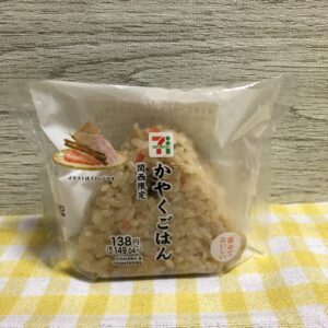 かやくご飯には、ごぼう、鶏肉、人参、ちくわ、油揚げなどが、細かく刻んで混ぜ込まれていて、こちらも具沢山なおにぎりになっています。
