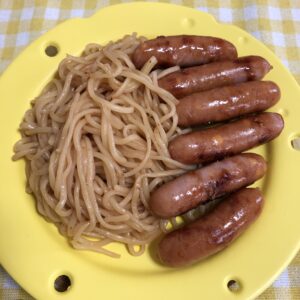 冷蔵庫に野菜がなかったので、せめてと思いウインナーを添えてみました。